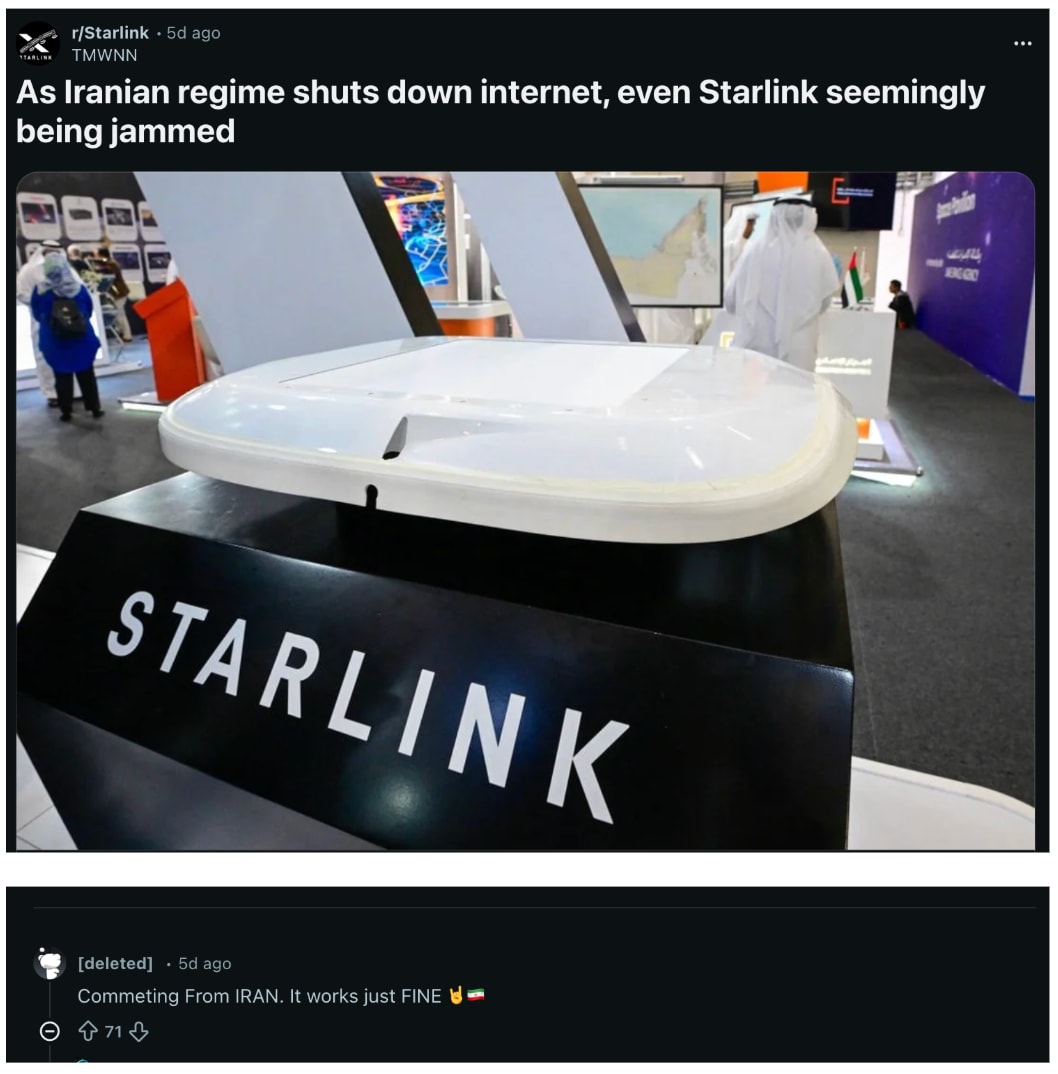 Iran’s regime tried to cement control with a near‑total internet shutdown. Even so, Starlink, smuggled in after sanctions eased in 2022, gave citizens a channel the state couldn’t fully police. The regime has tried to block Starlink by jamming GPS, but as always with anything on the internet, there are workarounds. It created real capacity for coordination, even if a full‑scale revolution didn’t follow.