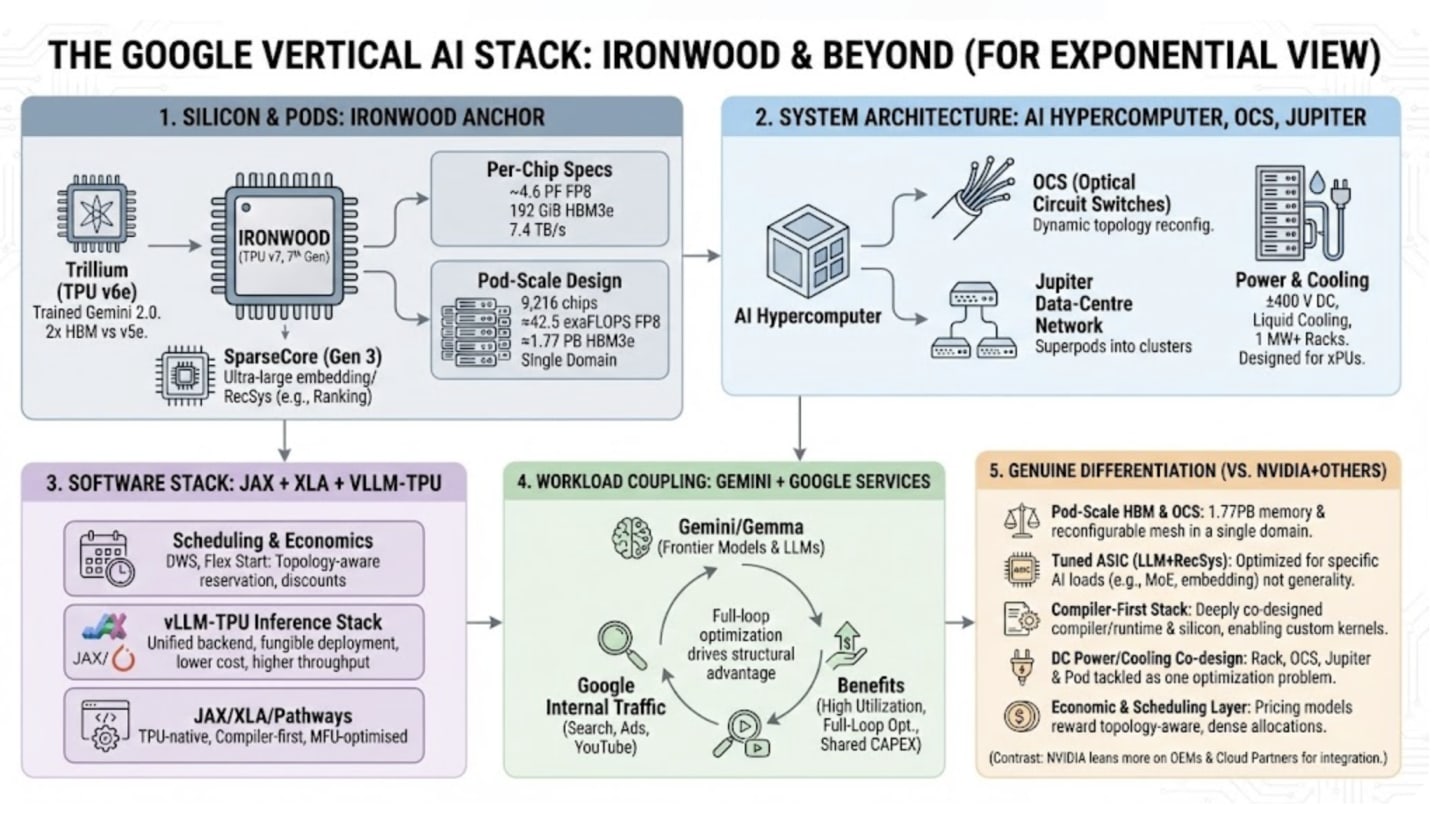 But the core Gemini stack – training and Google’s own first‑party serving – now runs almost entirely on its in‑house TPUs. And those Ironwoods are impressive. They are comparable to Nvidia’s Blackwell B200 chips, delivering similar amounts of raw processing (42 exaFLOPs FP8 for Ironwood) and the same 192GB of HBM3e memory. But Google’s chips only need to be good at one thing: “Google-style” house models, massive LLMs with Mixture-of-Experts inference, for high-throughput serving. And so Ironwood promises lower cost per token and latency for Google services.