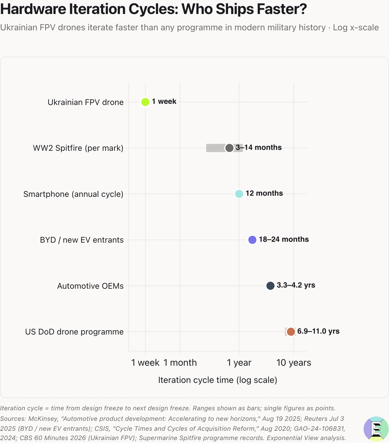 Much of this is familiar to Western firms, defense or otherwise. Performance is a criterion. Someone decides the drone should cost $800 and hit the target 70% of the time. The org spends three years building toward those numbers. By the time the product ships, the specification is an artefact of a long-forgotten planning meeting.