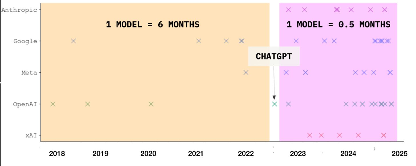 It’s triggered a dramatic race in research. Before ChatGPT launched, the big US labs released a major model every six months. After ChatGPT, releases picked up to one every two weeks.
