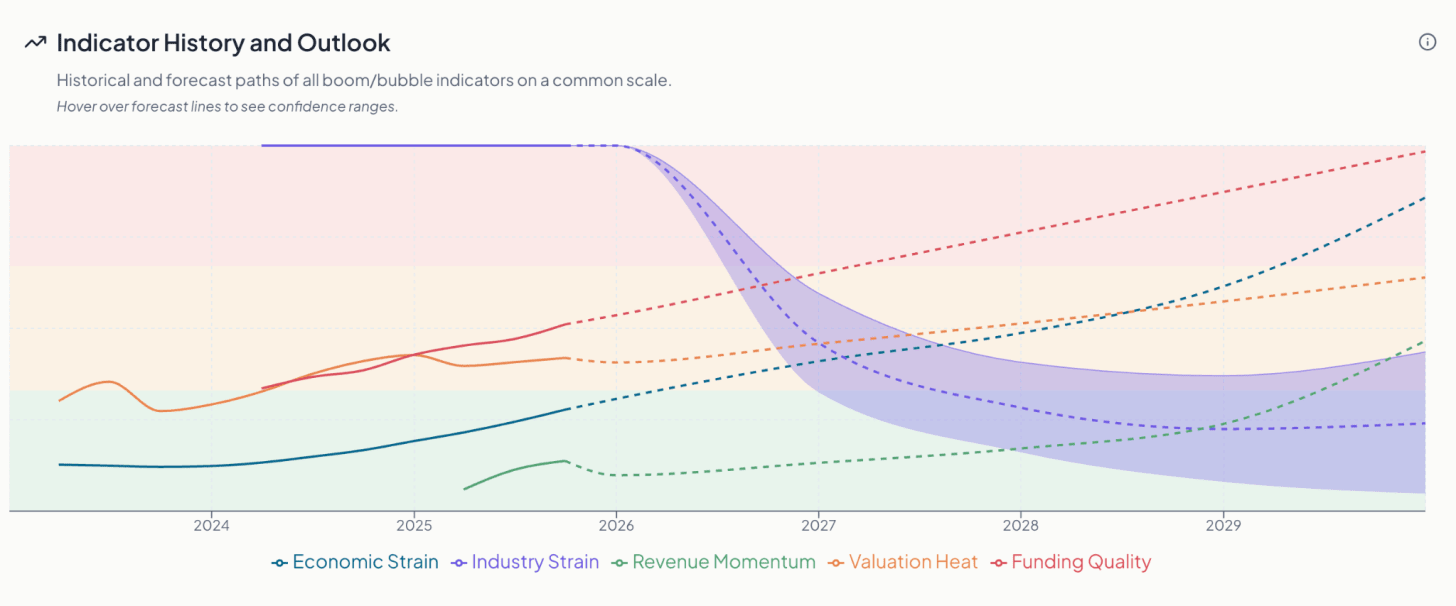 Boom/Bubble dashboard update: We’ve added projected trajectories for each of the five key indicators between now and 2029 – the indicator history and outlook is interactive and you can access it for free on the Boom/Bubble website.