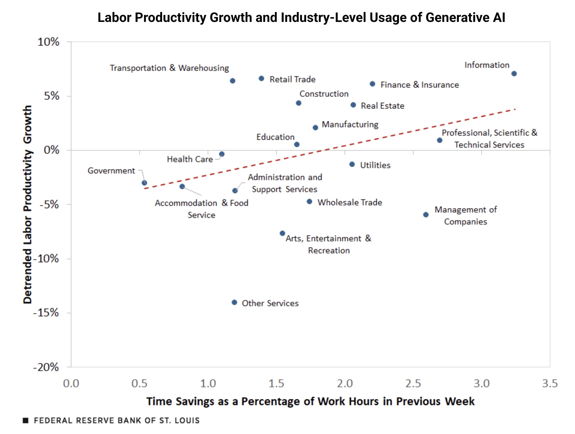 The St. Louis FED estimates that generative AI may have increased labor productivity by up to 1.3% – and has had positive effects on industry-level productivity. While that may sound modest, a sustained 1.3% annual productivity boost would be transformative1.