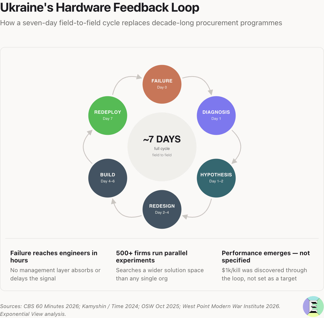 This is the operating model. A device is designed, fielded, disabled by the enemy, diagnosed through a conversation between the operator who lost it and the engineer who built it, then redesigned and redeployed in roughly seven days.