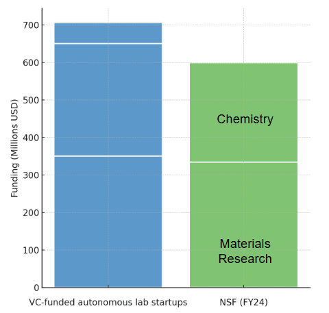 Science investments ↑ Venture-capital funding for autonomous labs now rivals the National Science Foundation’s yearly budget for materials and chemistry. Via