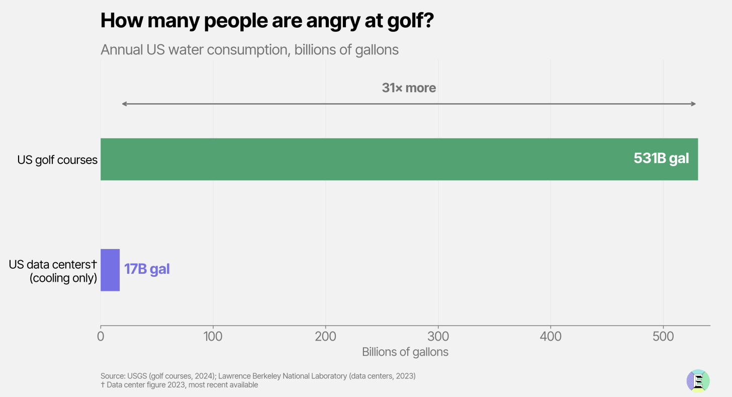 The mainstream has long picked the wrong fight over water. Golf courses in the US consume more than 30x as much water as the entire country’s data center industry uses for cooling.1