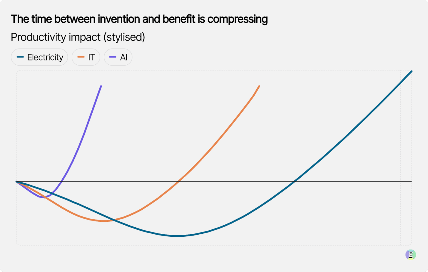 The best example, though, is JP Morgan, whose boss Jamie Dimon said: “We have shown that for $2 billion of expense, we have about $2 billion of benefit.” This is exactly what we would expect from a productivity J‑curve. With any general‑purpose technology, a small set of early adopters captures gains first, while everyone else is reorienting their processes around the technology. Electricity and information technology followed that pattern; AI is no exception. The difference now is the speed at which the leading edge is moving.