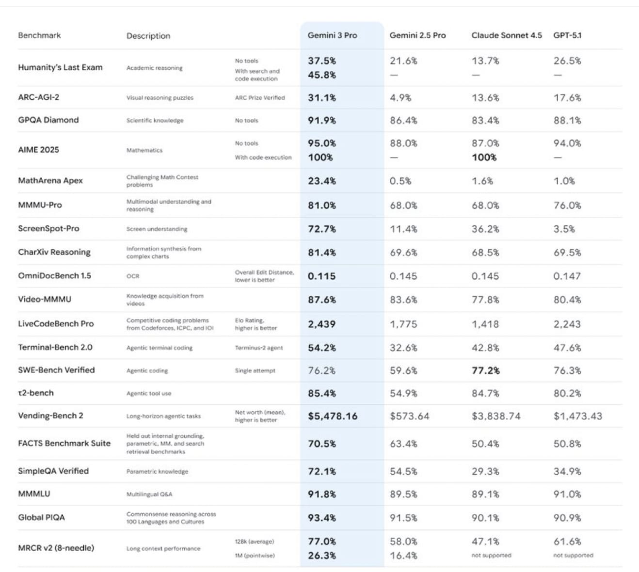 Model choice isn’t about novelty-chasing. You’re recalibrating the tone of a colleague you consult dozens of times each day. And for those who need numbers, Gemini 3 Pro tops Anthropic and OpenAI across a wide range of benchmarks.