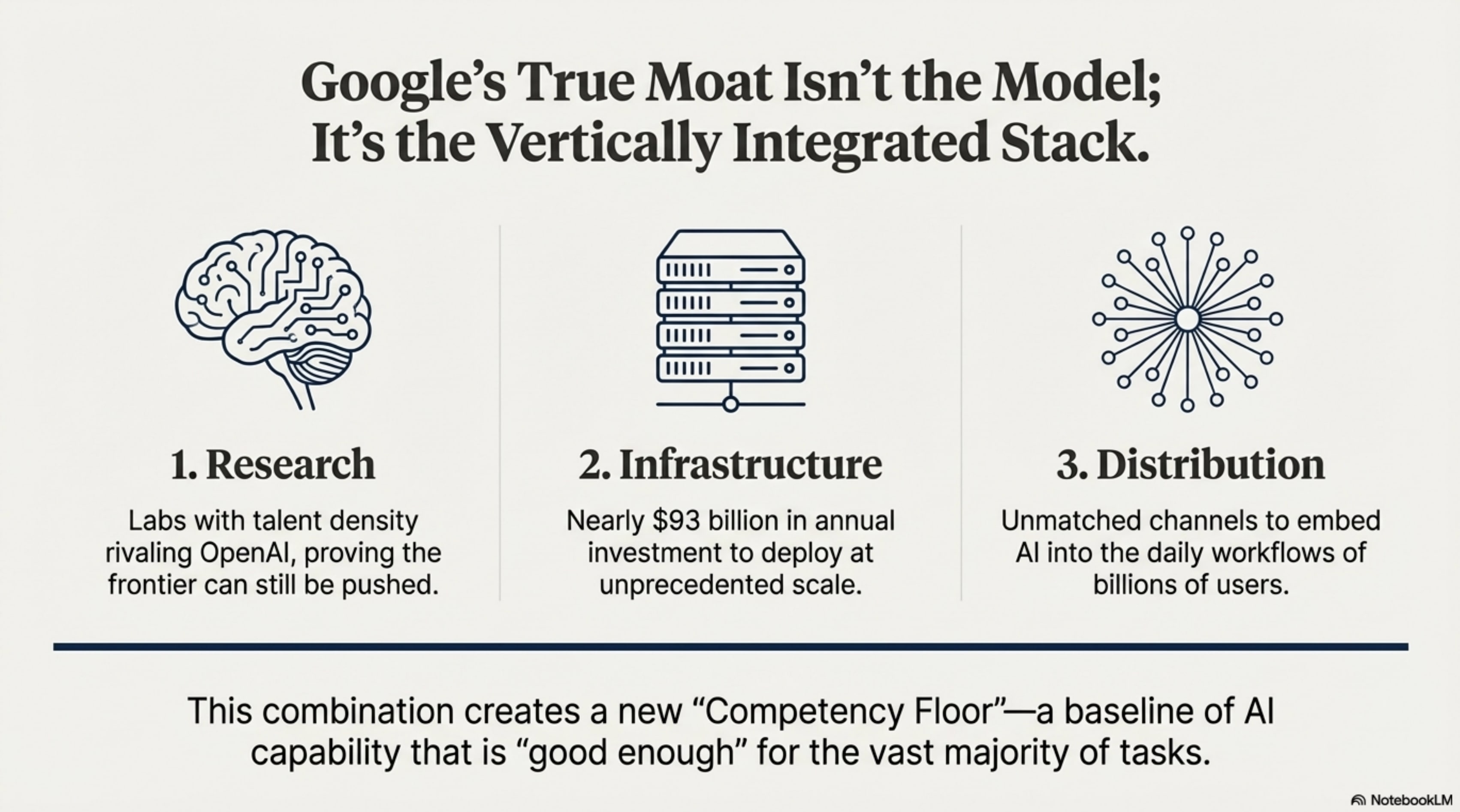 Google commands three fronts simultaneously: (1) research labs rivalling OpenAI’s talent density, (2) infrastructure investment approaching $93 billion annually, and – most crucially – (3) distribution channels no startup can replicate.