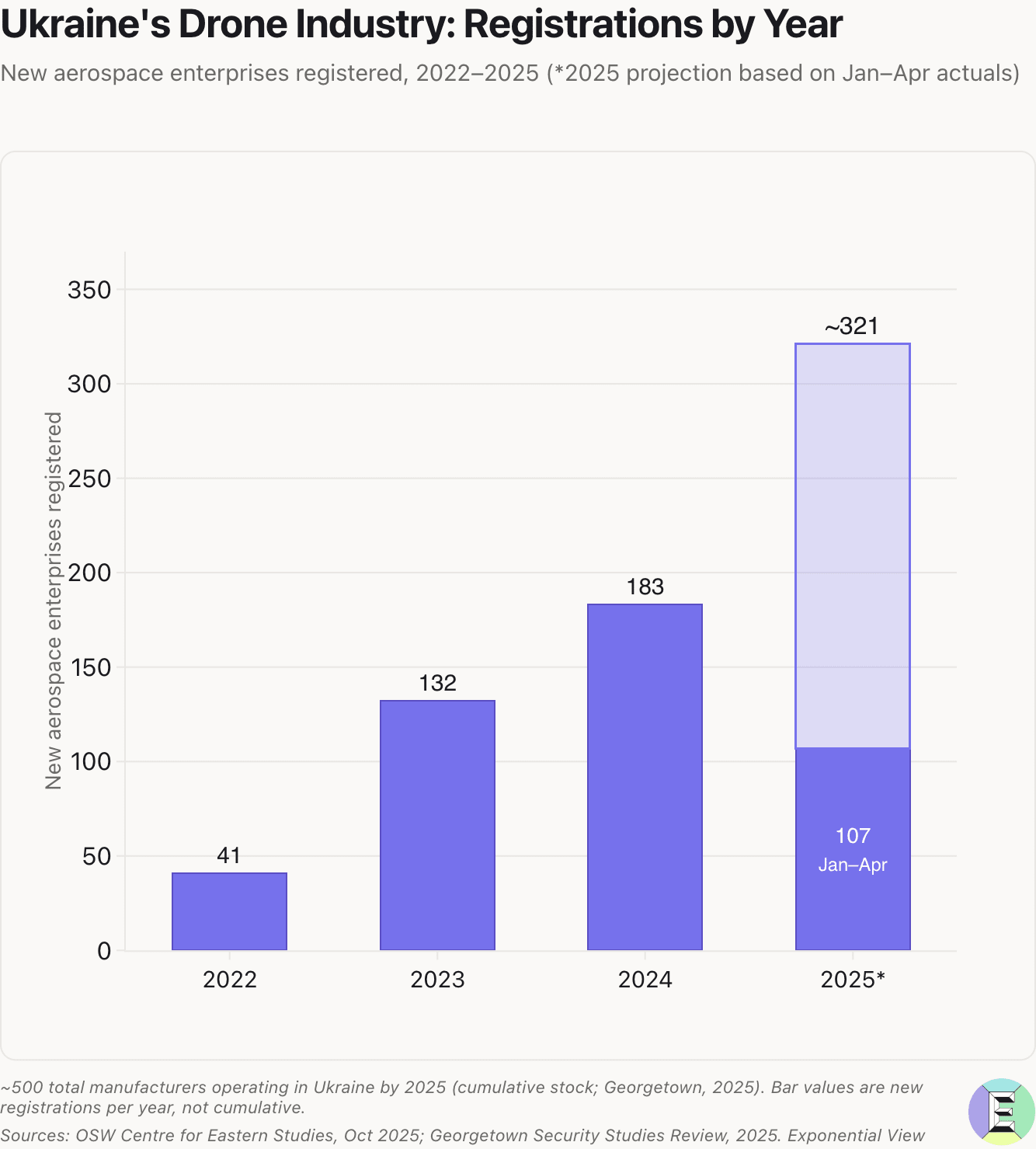 When Putin launched his invasion in 2022, there were perhaps seven domestic drone manufacturers in the whole of Ukraine. Today, Ukraine sports about five hundred manufacturers. Last year, they collectively produced 4 million units. The forecast for this year is seven million. Roughly 140x more drones than the United States produces in a year.