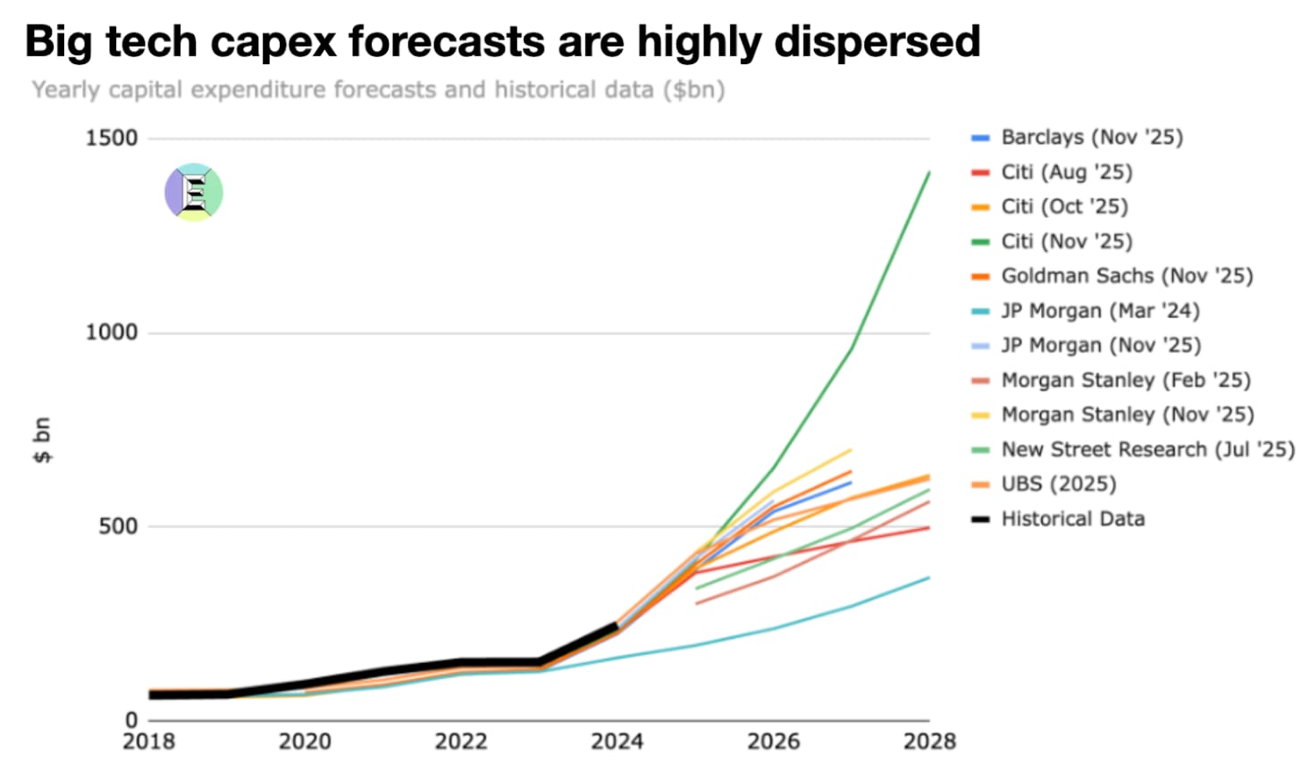 It’s created a cascade of spending commitments. Big tech firms have increased their capex from about $120-150 billion per year before ChatGPT, to closer to $400 billion this year. We reckon that in 2025, about $220-230 billion of that is incremental investment to meet AI demand. The bankers are struggling to make sense of it all.