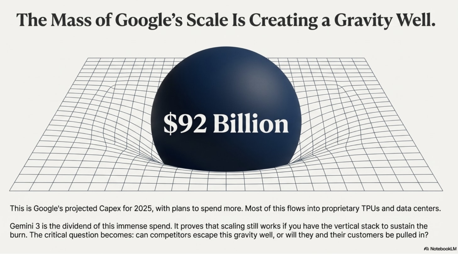 When massive objects warp spacetime, smaller things will either get captured by the gravity well or achieve escape velocity. Google is adding enormous mass to the AI field: $93 billion in capex, custom silicon, vertical integration top to bottom, coupled with the breakthroughs from the research team at Google DeepMind.