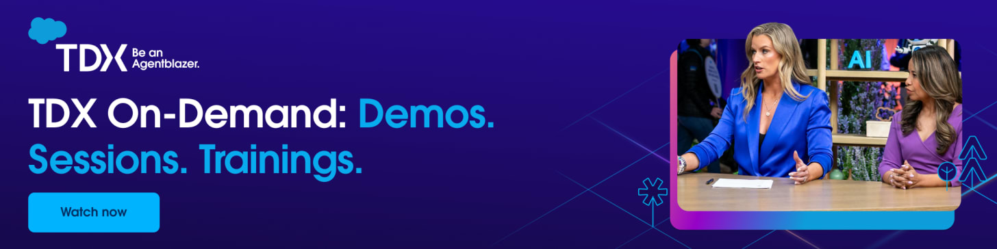 Catch the TDX sessions on Salesforce+ to see what this looks like in practice: deep dives on Agentforce, Data 360, the core Salesforce platform, vibe coding, Slack, and more – all available to stream for free.