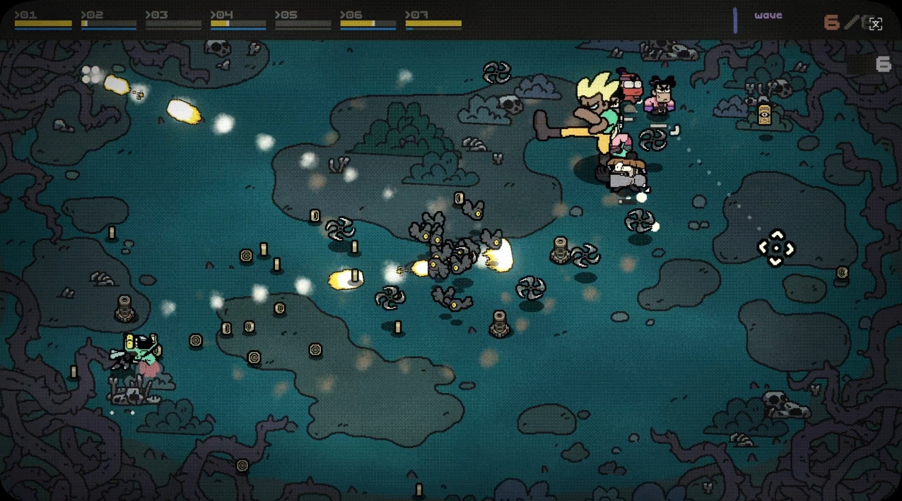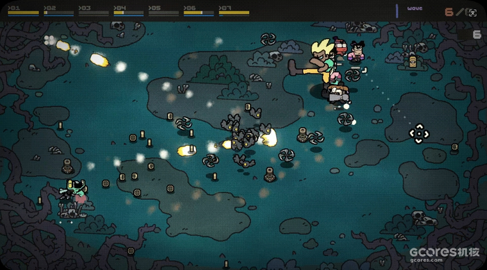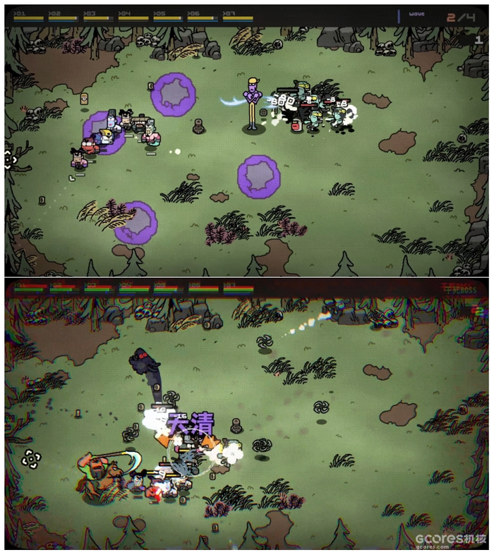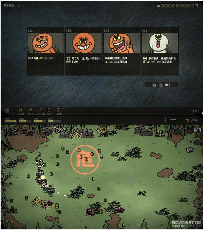 除了小队构筑玩法,游戏还加入了特殊助力机制。死亡的敌人会在场地中掉落金币,累计收集100个金币,场地中就会出现一个卡带道具,拾取该道具后即可召唤特殊角色助阵,实现一次随机范围的清版效果。