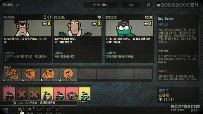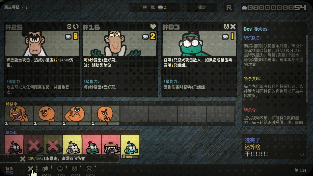 清场杀敌获取银两,在商店招募队员、构筑专属小队,游戏整体节奏比较轻松,大家可以多多尝试自己想要体验的组合——吃饭菜刀流,飞镖毒球流,小动物饲养流......