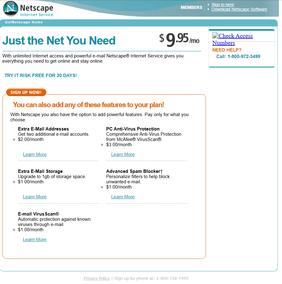 But for whatever reason, Netscape ISP kicked off operations on January 8, 2004, initially offering unlimited use for just $9.95 a month. Notably, it seems the name was the point—with the barebones site noting that you were getting a “reliable Internet connection from a name you trust.” It was also somewhat different from the contemporary AOL offering, in that you didn’t need a CD full of bloatware to access the service. The signup site went so far as to explain that you didn’t need to use a Netscape Navigator browser to access the service; any would do. As a cool bonus, you got a sweet “@netscape.com” email address when you signed up.