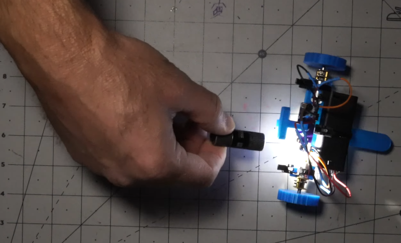 This is a classic beginner project made even easier with a 3D printer and PCB to hold the components. You might consider using an adjustable resistor to let you tune the sensitivity more easily. In addition, we’ve found that black tubes around the light sensors in this sort of application give you a better directional reading, which can help.