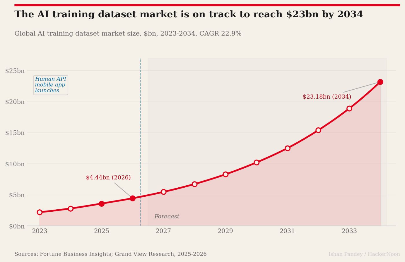 The global AI training dataset market was valued at $3.59 billion in 2025 and is projected to grow from $4.44 billion in 2026 to $23.18 billion by 2034, at a CAGR of 22.9%. Inside that market, human-generated data commands a premium over synthetic alternatives precisely because synthetic generation fails at the edge cases that determine whether a model is actually deployable across diverse real-world conditions.