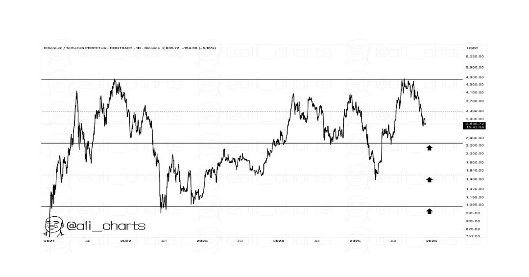 Ethereum has been struggling to maintain its recent rally, with price action retreating toward the $2835 zone and losing 5.16% within a short window. This decline has brought ETH back into a historical cluster of support levels formed between 2021 and 2025, a region where repeated rebounds shaped multi-year cycles.
