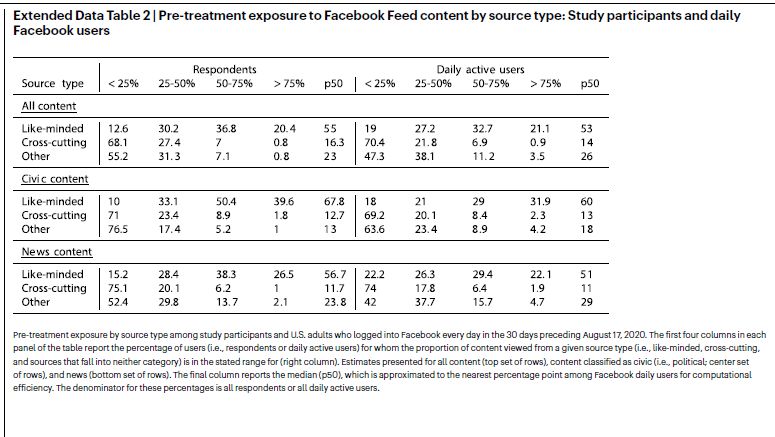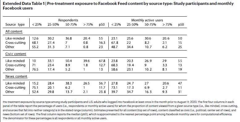 We note several other areas for future research. First, we cannot rule out the many ways in which social media use may have affected participants’ beliefs and attitudes prior to the experiment. In particular, our design cannot capture the effects of prior Facebook use or cumulative effects over years; experiments conducted over longer periods and/or among new users are needed (we note, however, that find no evidence of heterogeneous effects by age or years since joining Facebook). Second, although heterogeneous treatment effects are non-existent in our data and rare in persuasion studies in general44, the sample’s characteristics and behaviour deviate in some respects from the Facebook user population. Future research should examine samples that more closely reflect Facebook users and/or oversample subgroups that may be particularly affected by like-minded content. Third, only a minority of Facebook users occupy echo chambers yet the reach of the platform means that the group in question is large in absolute terms. Future research should seek to better understand why some people are exposed to large quantities of like-minded information and the consequences of this exposure. Fourth, our study examines the prevalence of echo chambers using the estimated political leanings of users, Pages, and groups who share content on social networks. We do not directly measure the slant of the content that is shared; doing so would be a valuable contribution for future research. Finally, replications in other countries with different political systems and information environments will be essential to determine how these results generalize.