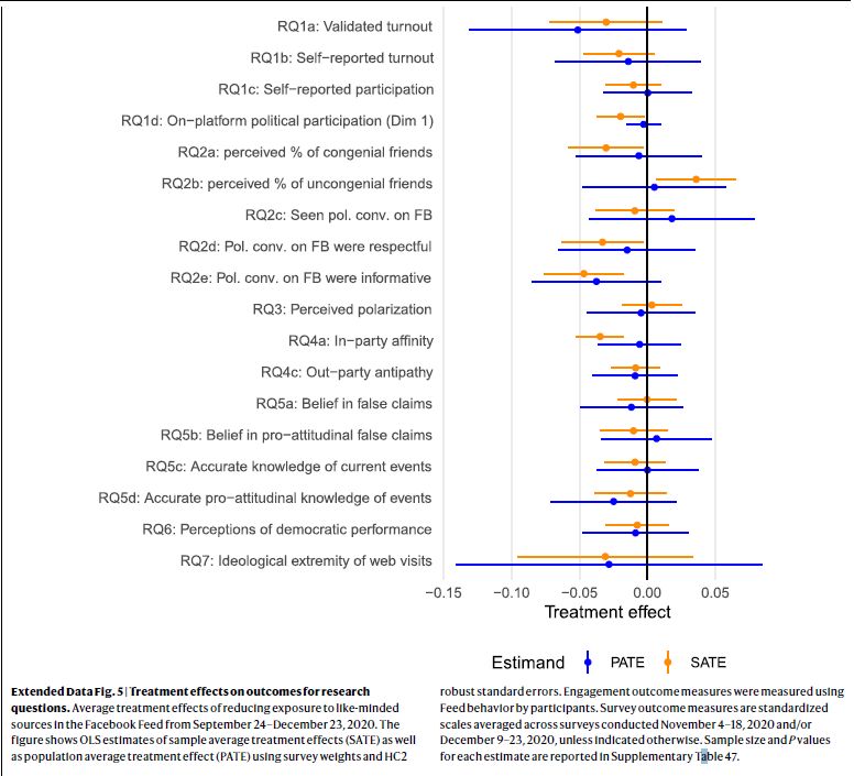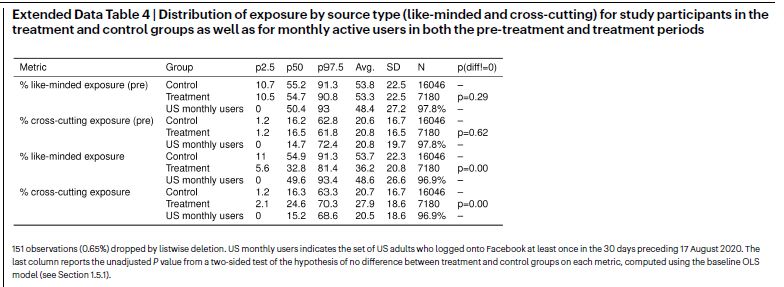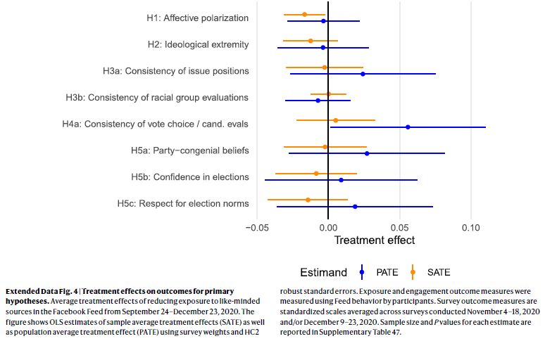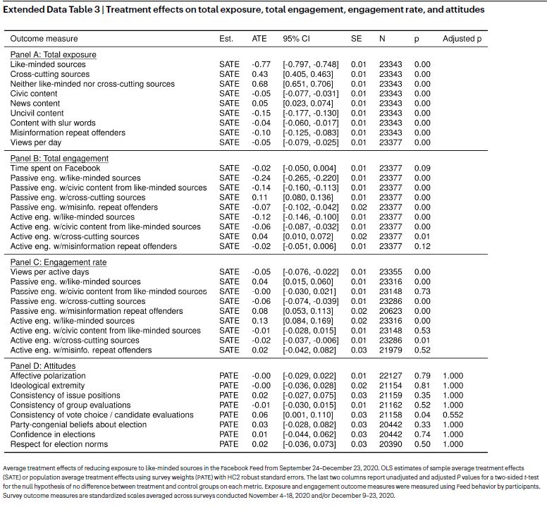 Finally, we found that reducing exposure to content from like-minded sources on Facebook had no measurable effect on a range of political attitudes, including affective polarization, ideological extremity and opinions on issues; our exploratory equivalence bounds analyses allow us to confidently rule out effects of ±0.12 s.d. We were also unable to reject the null hypothesis in any of our tests for heterogeneous treatment effects across many distinct subgroups of participants.