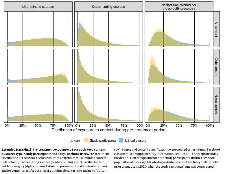 The Facebook Open Research and Transparency (FORT) team provided substantial support in executing the overall project. We are grateful for support on various aspects of project management from C. Nayak, S. Zahedi, I. Rosenn, L. Ahmad, A. Bhalla, C. Chan, A. Gruen, B. Hillenbrand, D. Li, P. McLeod, D. Rice and N. Shah; engineering from Y. Chen, S. Chen, J. Dai, T. Lohman, R. Moodithaya, R. Pyke, Y. Wan and F. Yan; data engineering from B. Xiong, S. Chintha, J. Cronin, D. Desai, Y. Kiraly, T. Li, X. Liu, S. Pellakuru and C. Xie; data science and research from H. Connolly-Sporing, S. Tan and T. Wynter; academic partnerships from R. Mersey, M. Zoorob, L. Harrison, S. Aisiks, Y. Rubinstein and C. Qiao; privacy and legal assessment from K. Benzina, F. Fatigato, J. Hassett, S. Iyengar, P. Mohassel, A. Muzaffar, A. Raghunathan and A. Sun; and content design from C. Bernard, J. Breneman, D. Leto and S. Raj. NORC at the University of Chicago partnered with Meta on this project to conduct the fieldwork with the survey participants and pair the survey data with web tracking data for consented participants in predetermined aggregated forms. We are particularly grateful for the partnership of NORC principal investigator J. M. Dennis and NORC project director M. Montgomery. The costs associated with the research (such as participant fees, recruitment and data collection) were paid by Meta. Ancillary support (for example, research assistants and course buyouts) was sourced by academics from the Democracy Fund, the Guggenheim Foundation, the John S. and James L. Knight Foundation, the Charles Koch Foundation, the Hewlett Foundation, the Alfred P. Sloan Foundation, the Hopewell Fund, the University of Texas at Austin, New York University, Stanford University, the Stanford Institute for Economic Policy Research and the University of Wisconsin-Madison.
