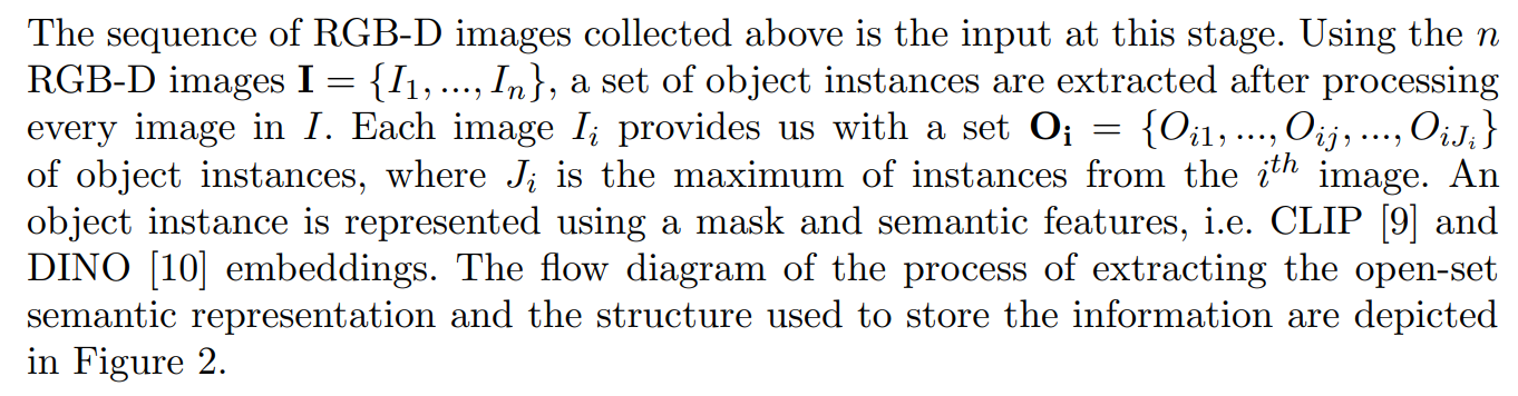 \ To improve our comprehension of the semantic aspects of object instances that have been segmented and masked within our images, we employ two models, CLIP [9] and DINOv2 [10], to derive the feature representations from the cropped images of each object. A model trained exclusively with CLIP achieves a robust semantic understanding of images but cannot discern depth and intricate details within those images. On the other hand, DINOv2 demonstrates superior performance in depth perception and excels at identifying nuanced pixel-level relationships across images. As a self-supervised Vision Transformer, DINOv2 can extract nuanced feature details without relying on annotated data, making it particularly effective at identifying spatial relationships and hierarchies within images. For instance, while the CLIP model might struggle to differentiate between two chairs of different colours, such as red and green, DINOv2’s capabilities allow such distinctions to be made clearly. To conclude, these models capture both the semantic and visual features of the objects, which are later used for similarity comparisons in the 3D space.
