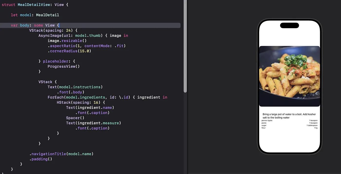 Because we did the heavy lifting during the decoding phase — filtering empty values and grouping ingredients — our SwiftUI code becomes incredibly clean. We don’t need any complex logic in the View; we just map the data directly to the components.