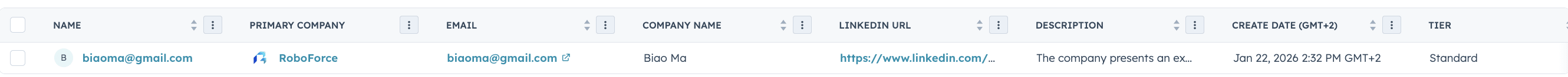 It then uploads this information directly to your CRM, whether that’s HubSpot (as shown in the images below) or a simple Google Sheet, so you can easily track all submissions and revisit them when needed.