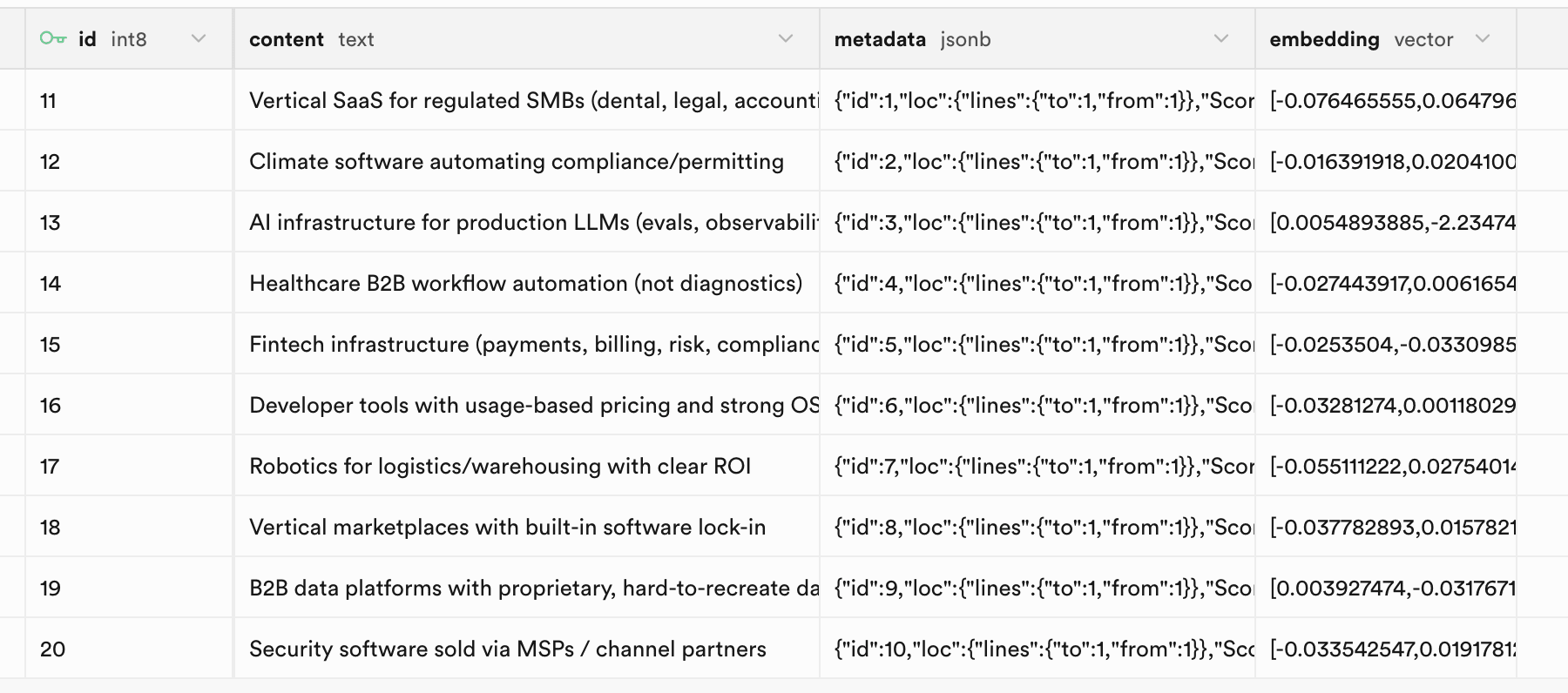 Second, a vector database trained on your portfolio companies and the scores you’d retroactively assign them. Did successful and unsuccessful investments have common themes? What was the industry? Was the founder first-time or not? This “trains” the system on pattern recognition specific to your fund’s actual history.