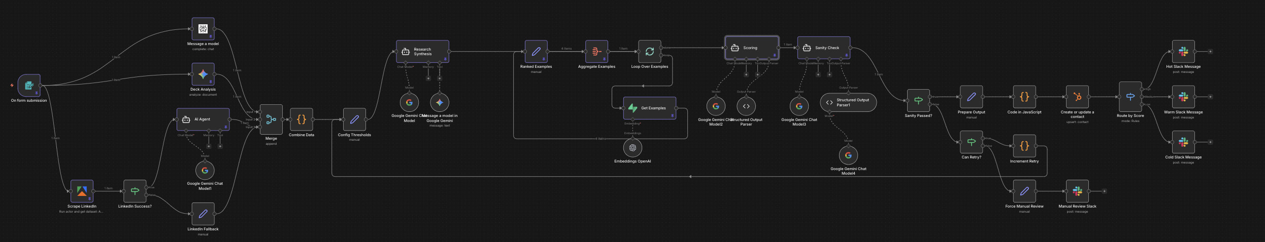 An end-to-end workflow that turns inbound startup decks into scored CRM entries with thesis-aligned analysis. The whole thing runs in sub-60 seconds per deck 24/7.
