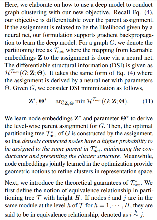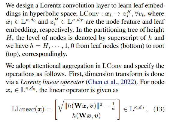 \ Overall architecture of LSEnet is sketched in Figure 2. In hyperbolic space, LSEnet first embeds leaf nodes of the tree, and then recursively learns parent nodes, self-supervised by our new clustering objective Eq. (4).