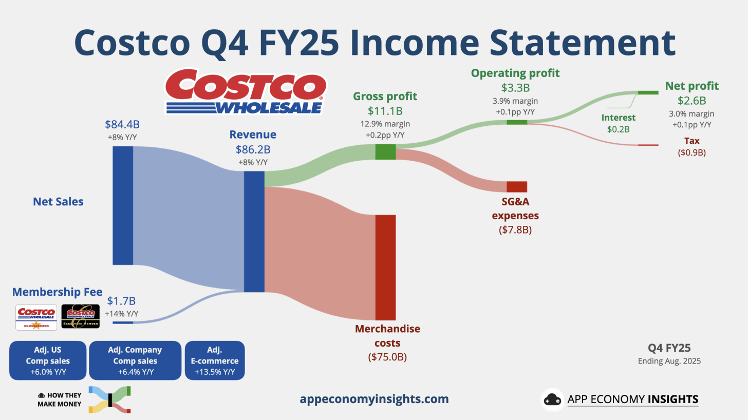 Costco closed out FY25 (ending in August) with Q4 revenue growing 8% Y/Y to $86.2 billion ($100 million beat) and EPS of $5.87 ($0.06 beat). However, the beat was overshadowed by moderating growth in adjusted same-store sales to +6.4% globally and +6.0% in the US (down from 8.0% and 7.9% last quarter, respectively).