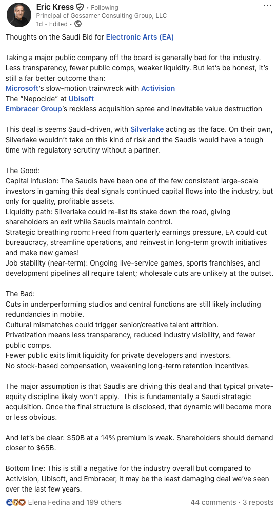 Why this capital matters: Deep pockets mean EA can fund multi-year live-ops and big bets without quarterly whiplash. That aligns with an LBO built on recurring bookings.