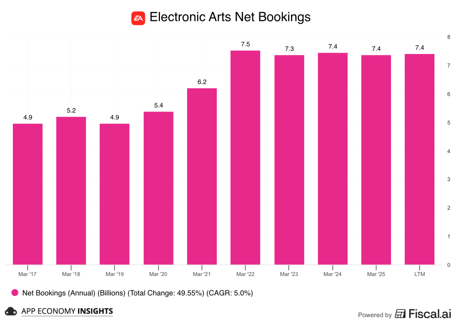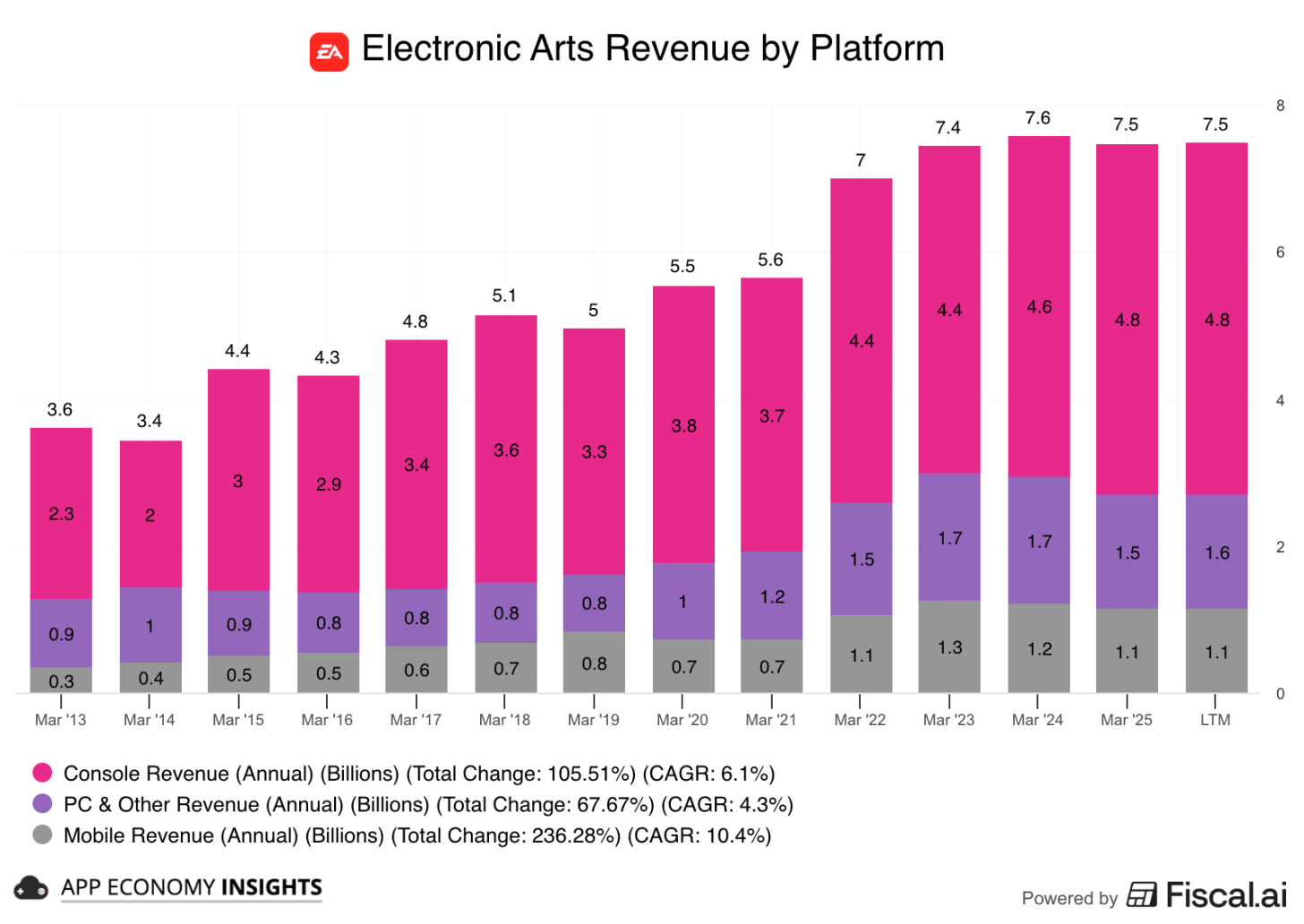 Industry backdrop: The global games market has been nearly flat over this stretch, from $184 billion in 2022 to a projected $189 billion in 2025, with consoles leading modest growth while mobile slowed. So EA has been in line with the industry.