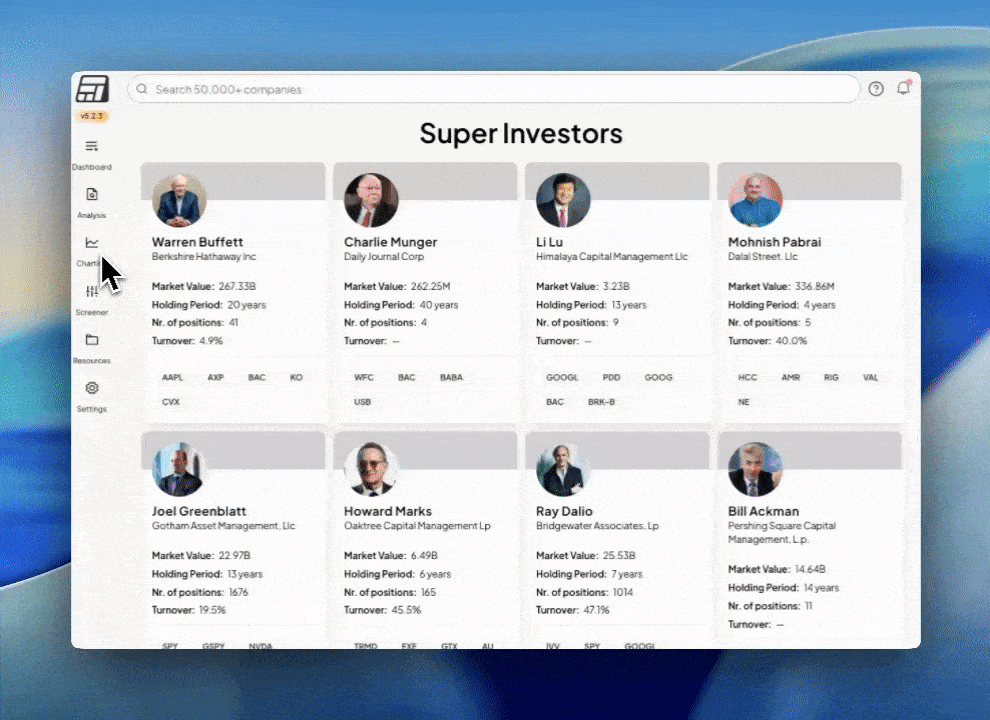 Our partners at Fiscal.ai gather the data on Super Investors and visualize their portfolio for you. Pick your favorite investors and see how their holdings have evolved.