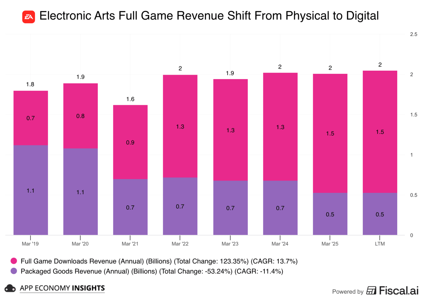 Mobile grew through acquisitions: EA has struggled with mobile and most of its growth there since 2021 came from the acquisition of Glu Mobile ($2.1 billion) and Playdemic ($1.4 billion).