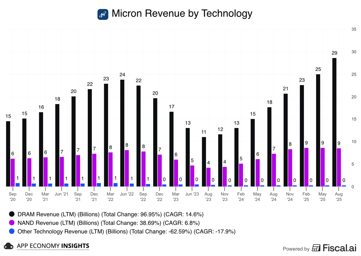 DRAM (including HBM) is the engine. LTM DRAM revenue fell from the 2022 peak, bottomed in mid-2023, and has re-accelerated to ~$29 billion LTM (see visual). That rebound is the HBM ramp plus DDR5 strength.