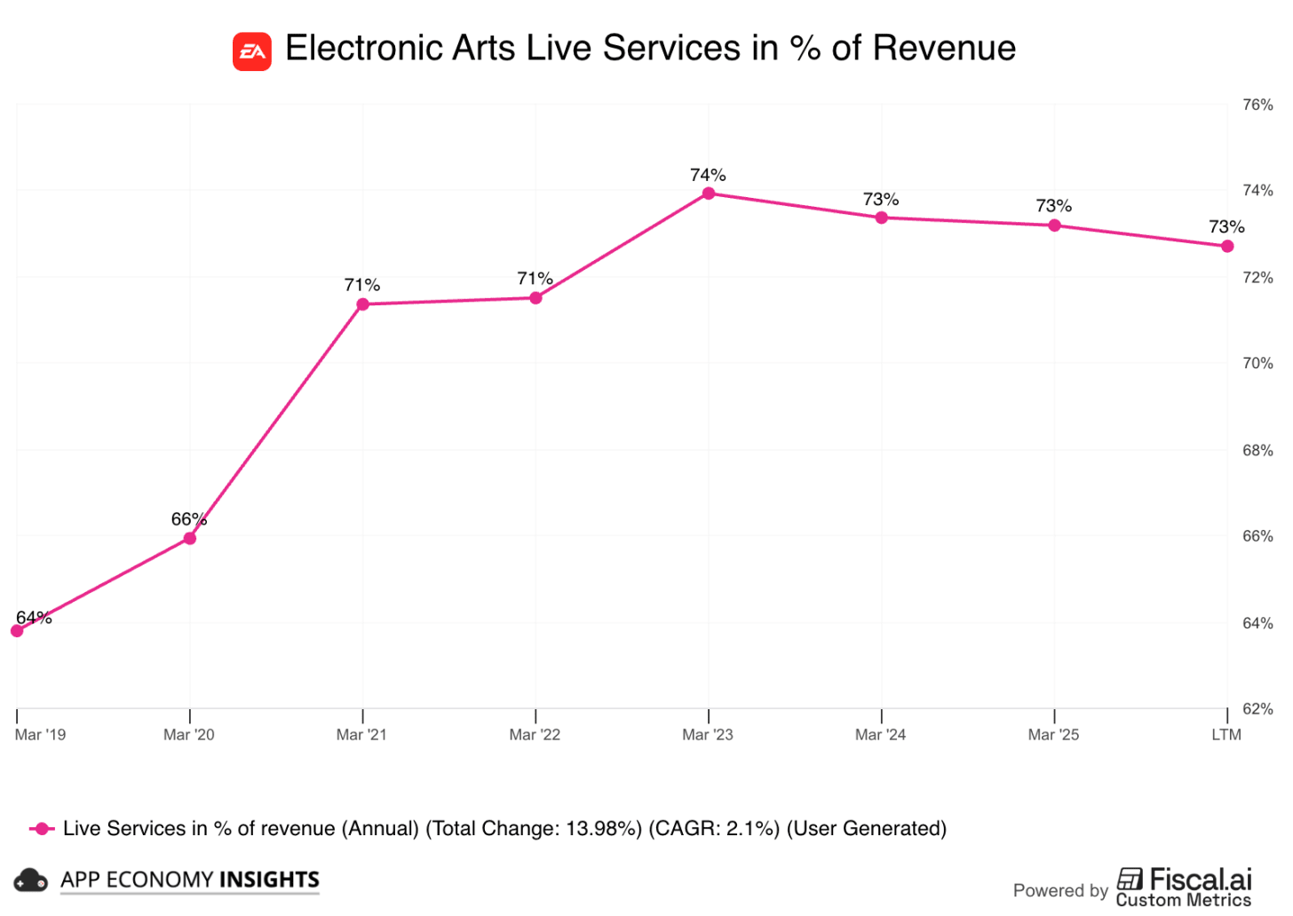 I created the graph below using the Custom Metrics screen on Fiscal.ai, our data platform partner. It allows you to visualize any ratio or specific segment or KPI over time. In this example, I used Live Services revenue in % of overall revenue.