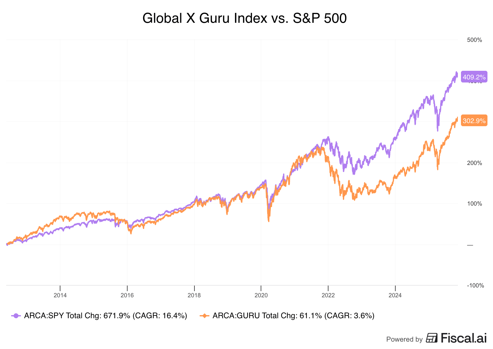 The Global X Guru ETF (GURU), built to track top hedge fund holdings, has underperformed the S&P 500 over the past decade, even before fees.