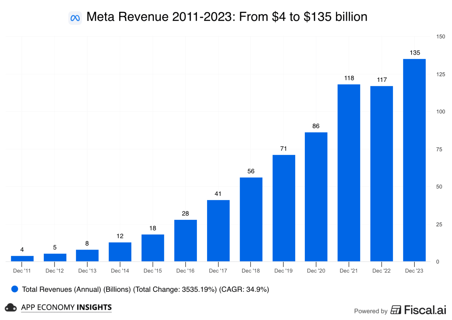 For perspective, Meta needed 12 years to go from ~$4 billion to ~$135 billion in annual revenue, across a family of apps used by 3+ billion people each month.