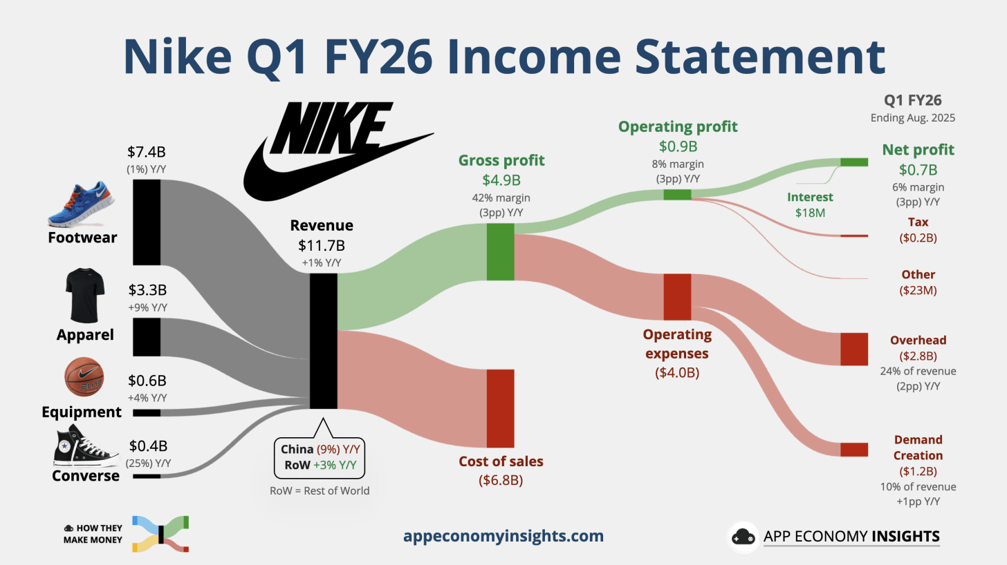 Nike’s turnaround showed its first tangible signs of success in its Q1 FY26 (August quarter), with revenue returning to growth, up 1% Y/Y to $11.7 billion (a massive $710 million beat). It was the first quarter of positive growth since February 2024.