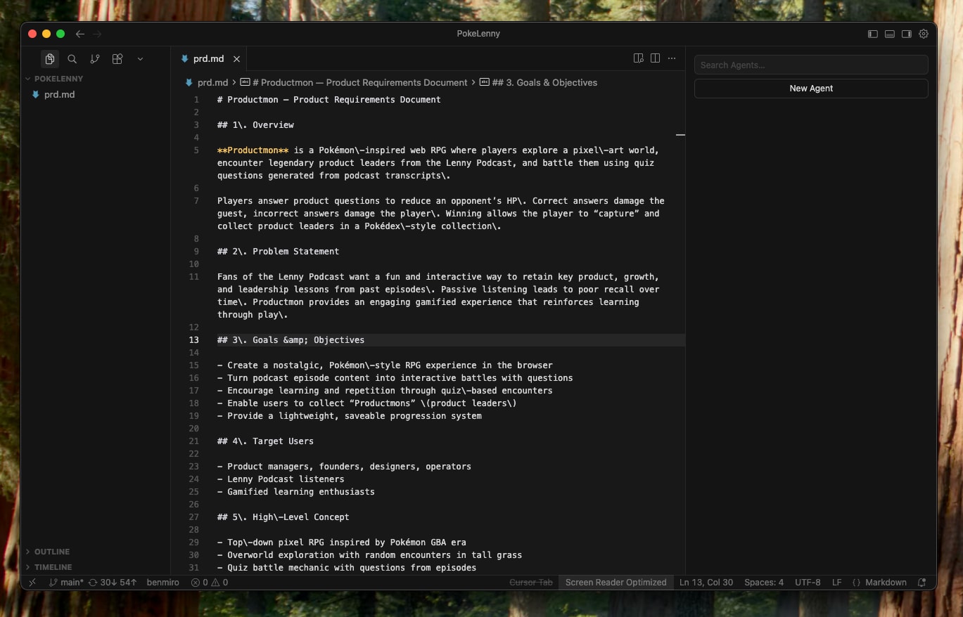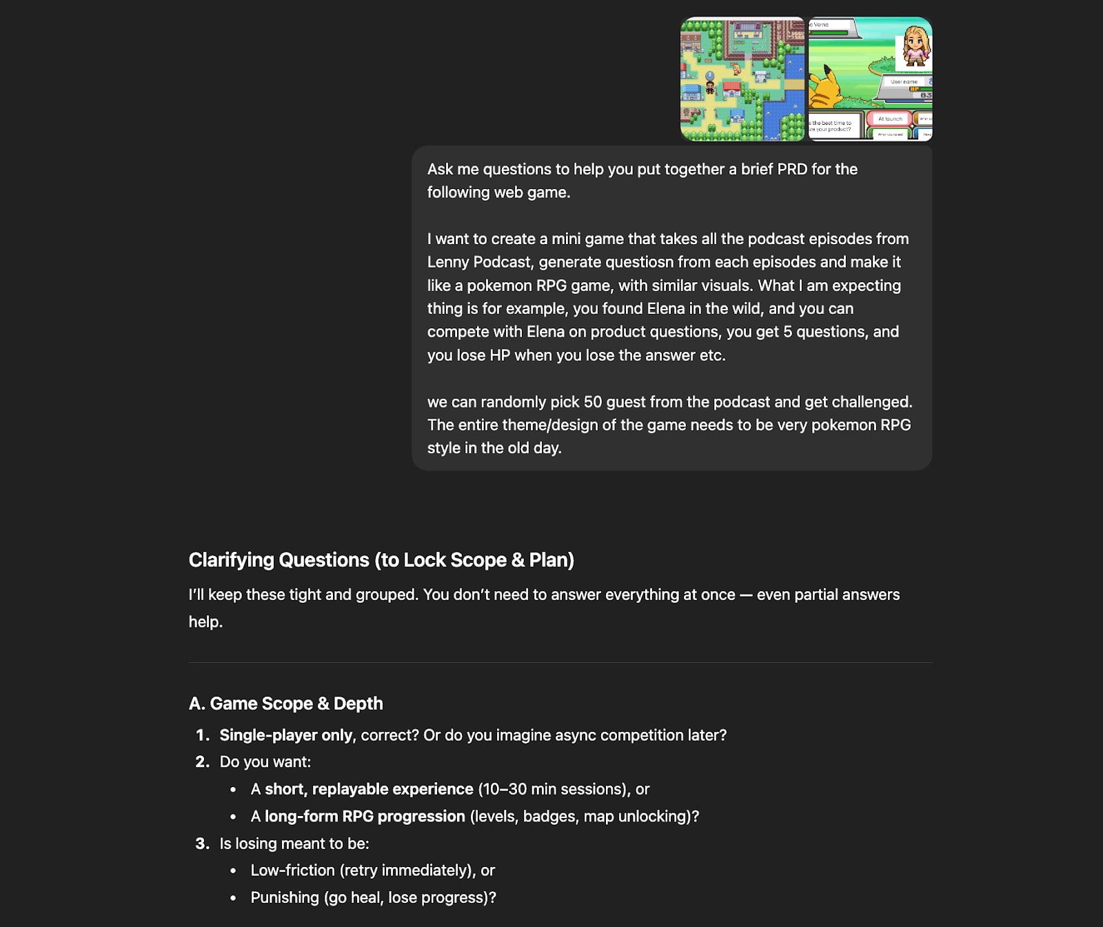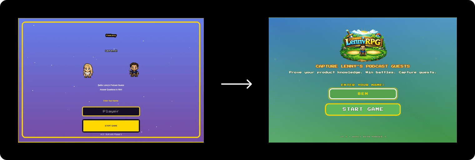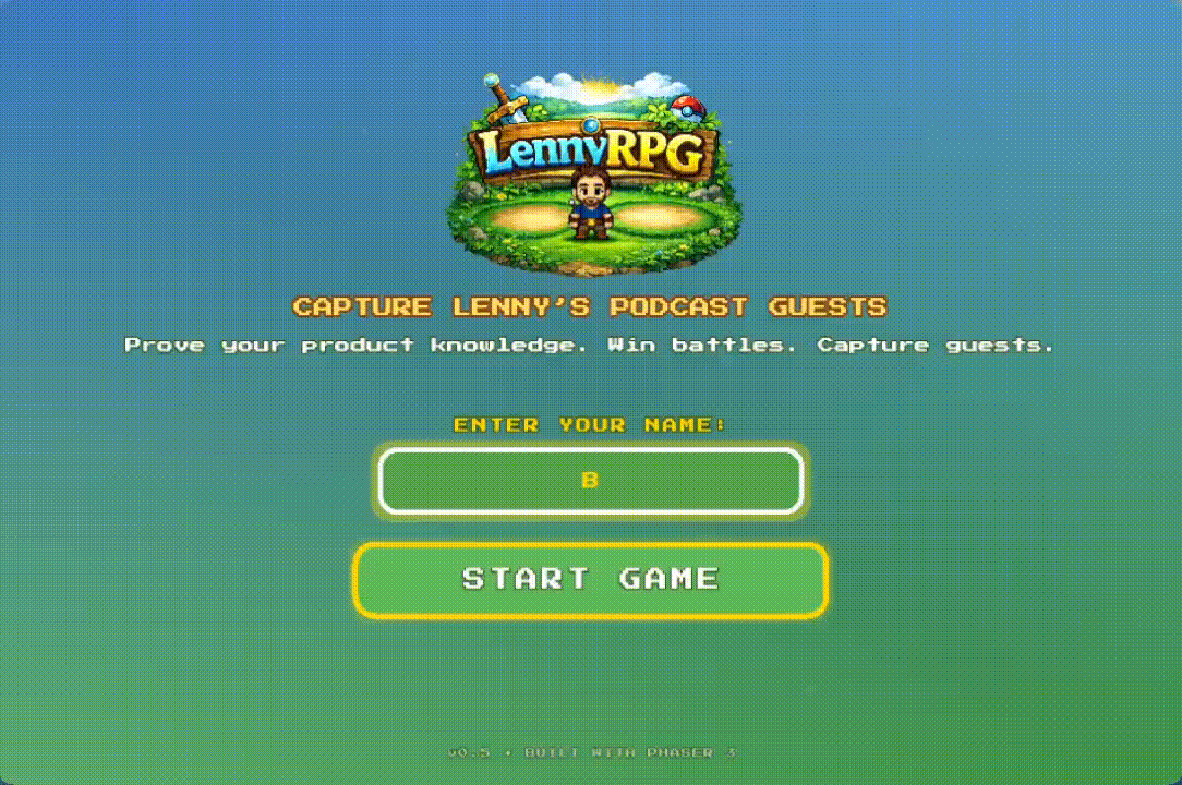 The core idea was simple: turn Lenny’s Podcast into a Pokémon-style RPG where players encounter podcast guests in the wild and battle them through product questions.