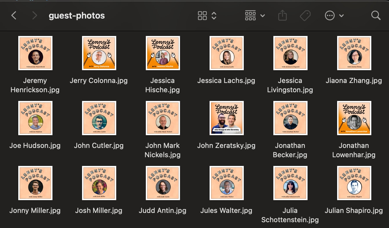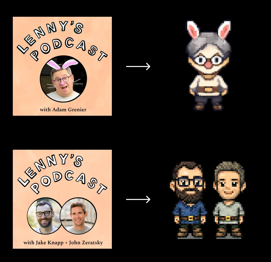 And of course, for each output, I had to check one by one to make sure the sizes and styling were similar and matched how the guests looked in the podcast cover. This was one of the most interesting steps because there were a few fun edge cases. For example, I didn’t know Adam Grenier really has rabbit ears on top of his profile image in the original podcast cover—I almost deleted them. Or there are episodes with two people in the cover image, like Jake Knapp and John Zeratsky’s episode, so I had to tell AI to generate a single separate image for each person.