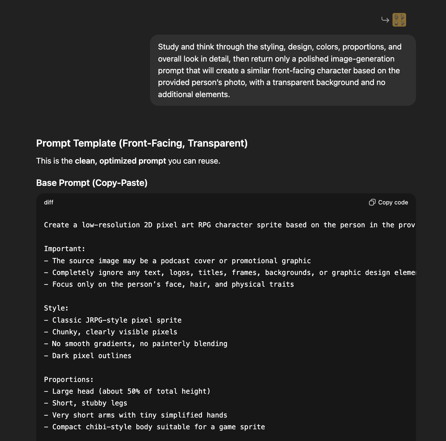This is where I used OpenAI Playground to repeatedly test and refine my prompt, as well as testing which models work the best for the task. I kept adjusting it until every generated avatar followed the same style and looked like it belonged to the same game.