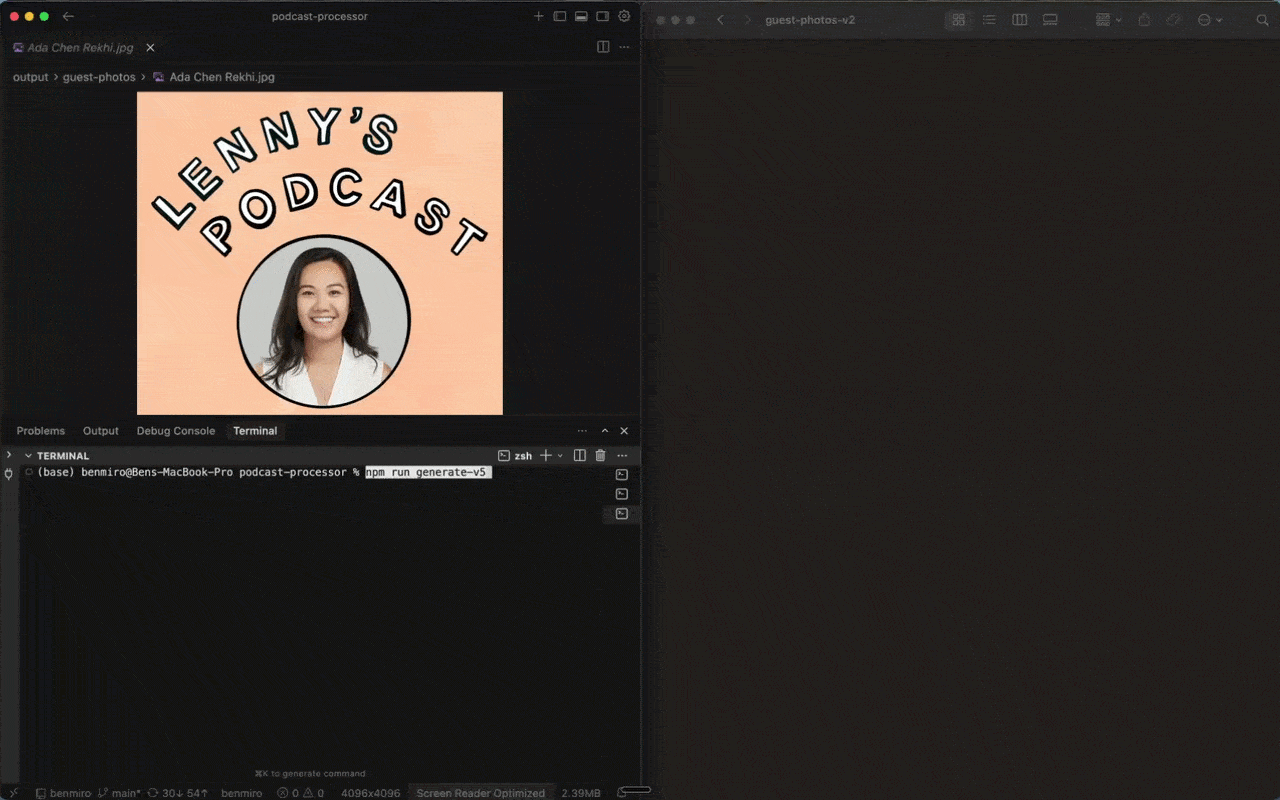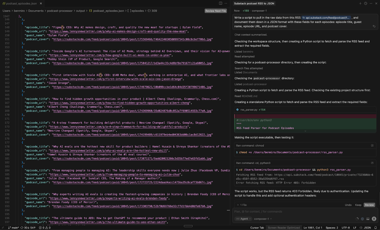 Fortunately, every Lenny’s episode already includes an episode cover that contains the guest’s avatar. For this, I triggered Cursor’s Composer to pull RSS feed again to pull the image URLs, downloaded them locally, and used those as inputs for avatar generation.
