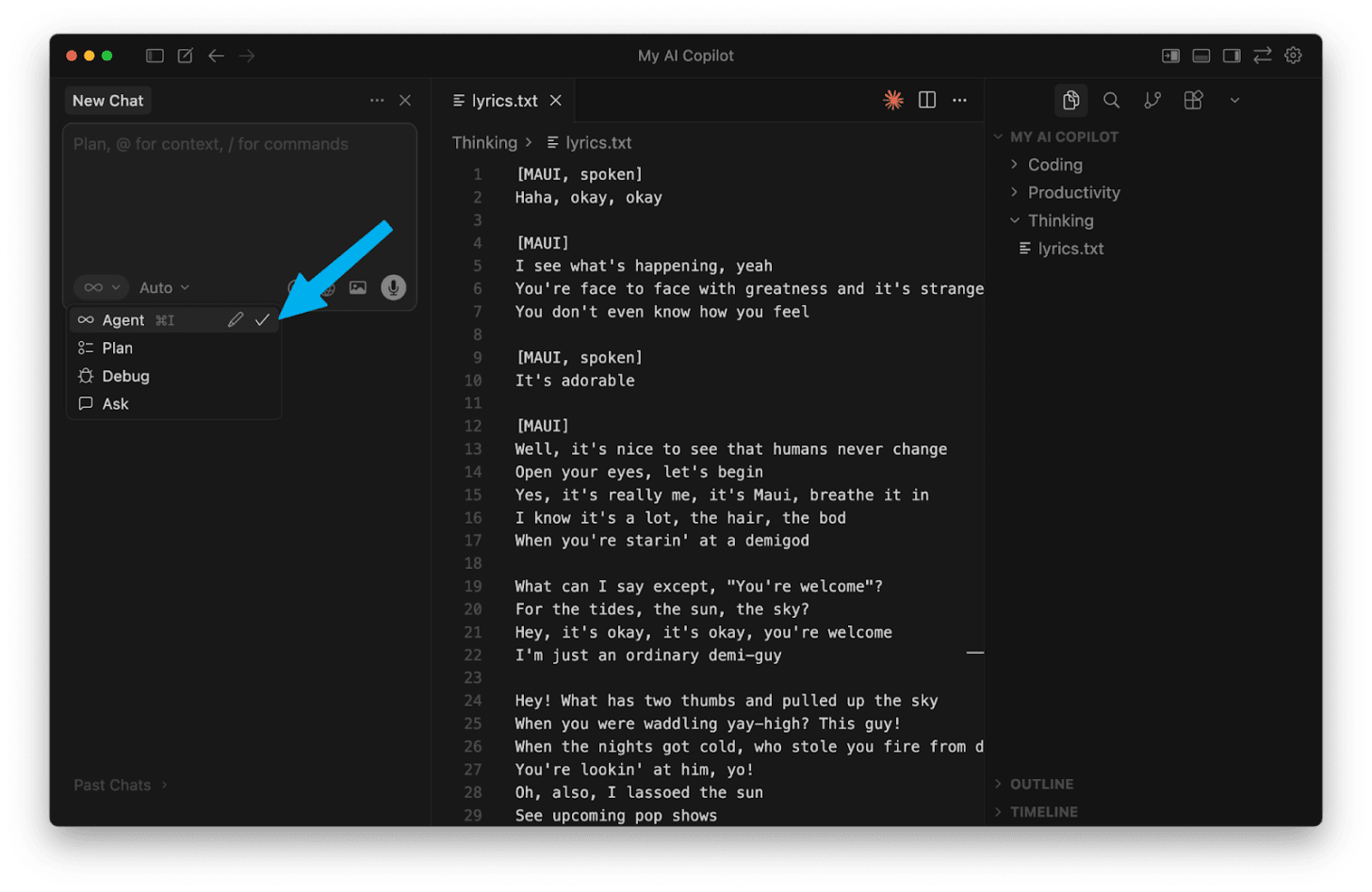Make sure you’re in “Agent” mode. This allows Cursor to take actions (such as fetching this post from the internet).
