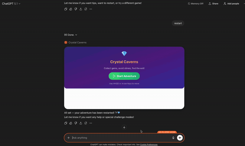ChatGPT apps don’t have to be as simple as showing a video or displaying a card. You can build full, complex applications directly into ChatGPT. Here’s a quick example of a dungeon explorer game I built with Chippy. You can see that ChatGPT has context on my current level, information about the game, and can give me tips on improving my score.