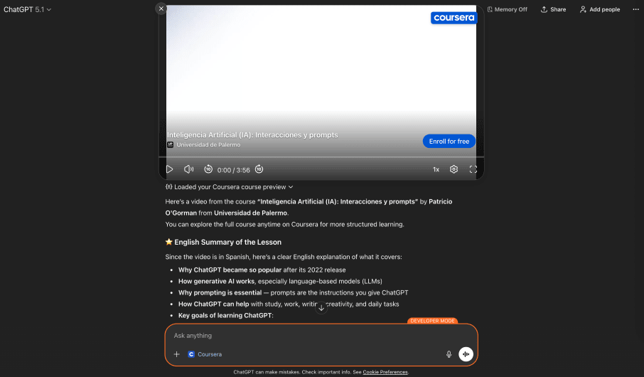 Picture-in-picture mode keeps a small floating window visible while the user chats. This is ideal for music players, timers, or anything a user might want to keep running in the background while they work on something else. Here, Coursera is playing a video while I continue chatting.