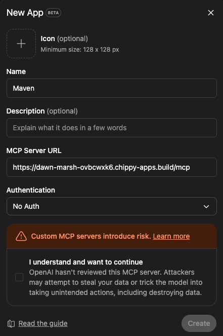 Add a Name, MCP Server URL, and set Authentication to No auth. Once you click Create, you’ve successfully made your first ChatGPT app!