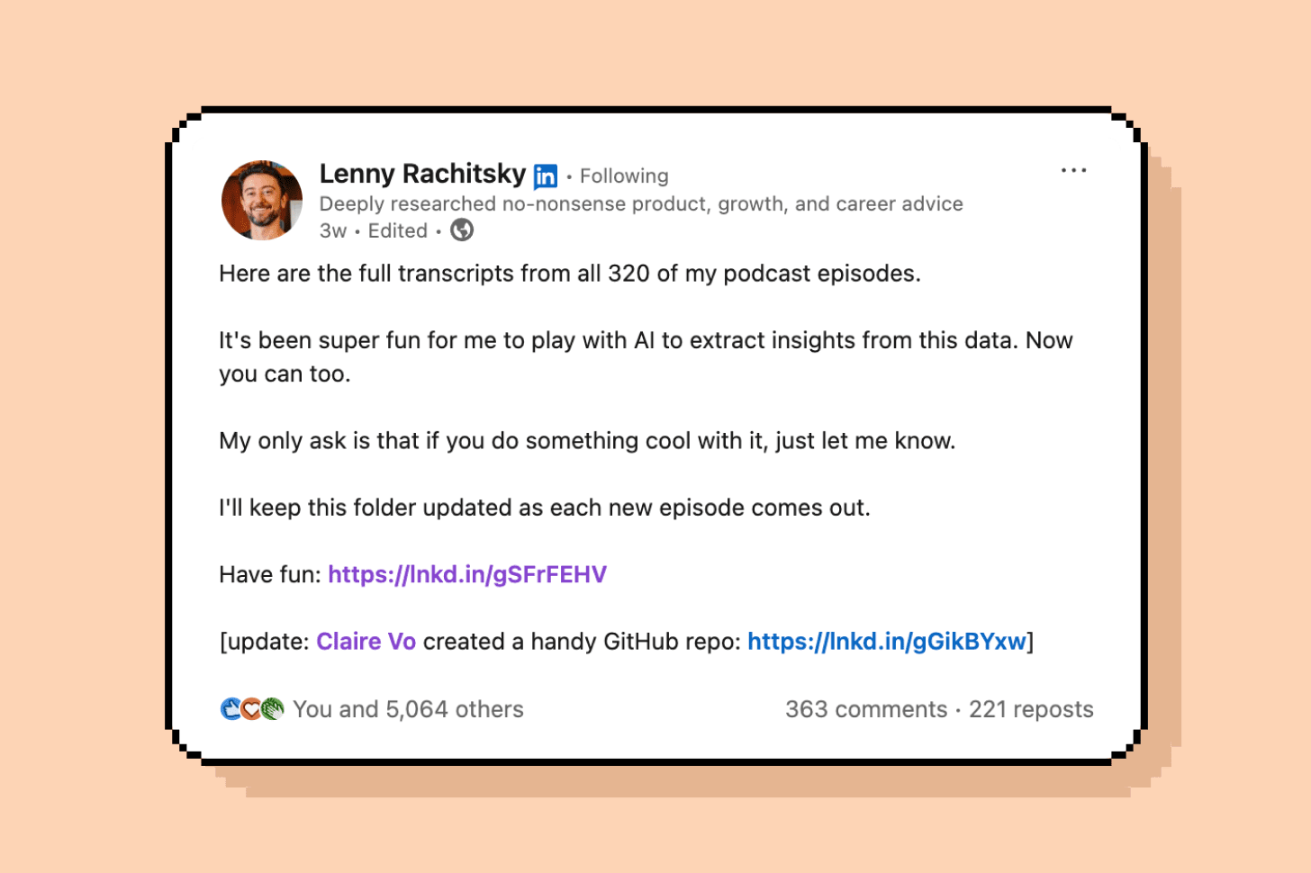 A few months ago, I shared all of my podcast transcripts on socials on a whim, and holy sh*t, y’all found such incredibly creative ways to use this data: parenting wisdom rooted in PM advice, user research scripts, antimemes, an infographic for every episode, a “Learn from Lenny” Twitter bot, and at least 50 other amazing projects.